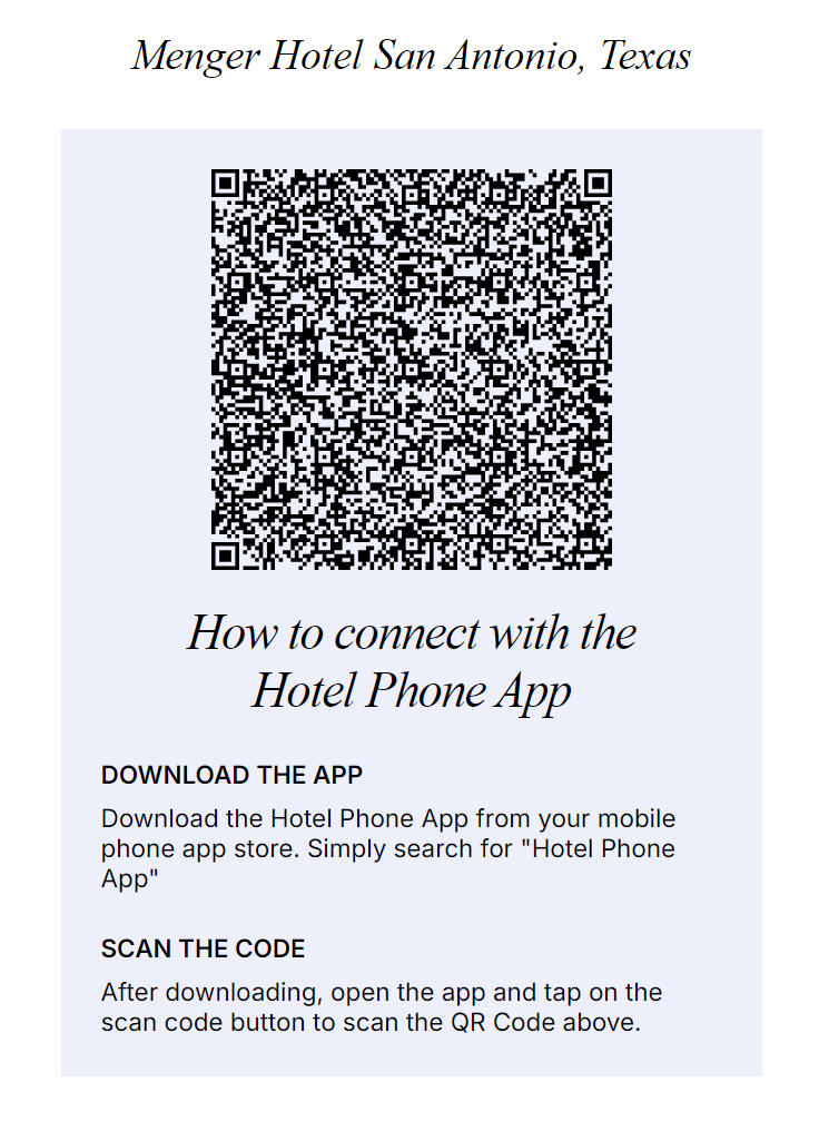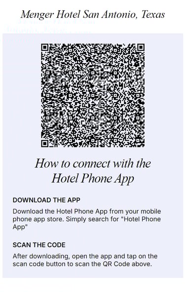 Hotels install HOTEL PHONE APP ™ QR code display signs in guest rooms.